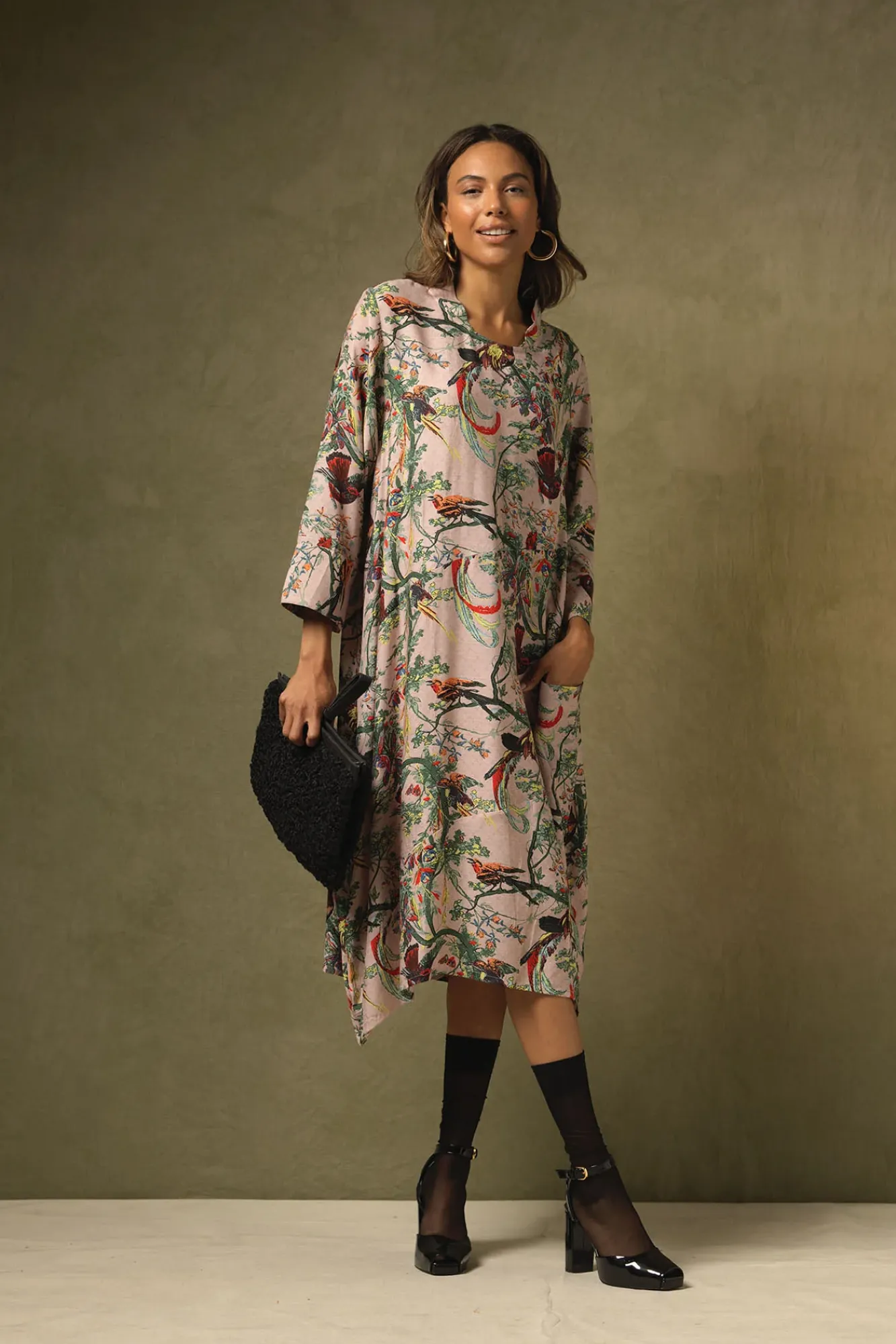 This 3/4 Length Dress Is Cut To Hang Asymmetrically, Has A Delicately Detailed Collar And Two Handy Pockets, One On The Front And Another Hidden Within The Side Seam.