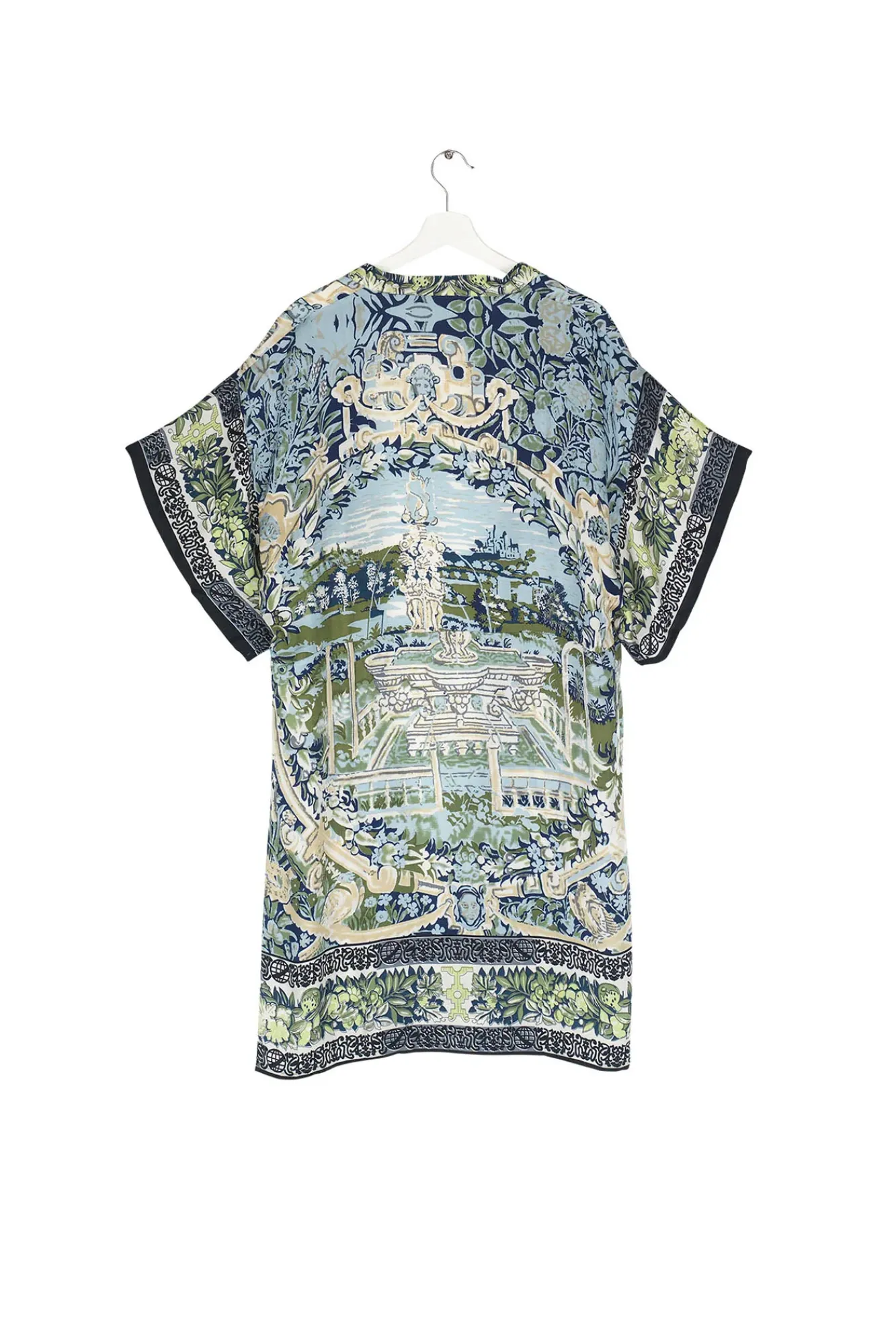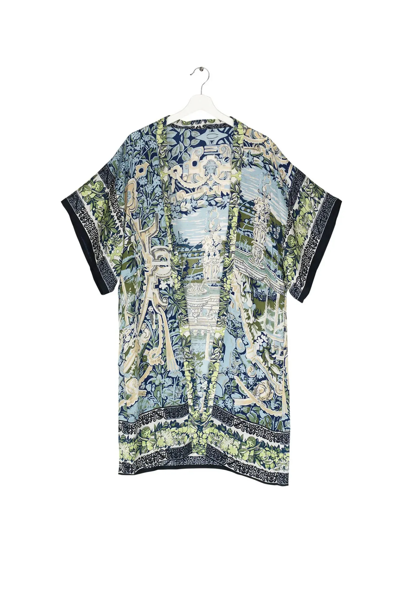 Inspired By Antique Flemish Tapestries, This Print Features Beautiful Garden Scenes In Sea Greens And Blues.