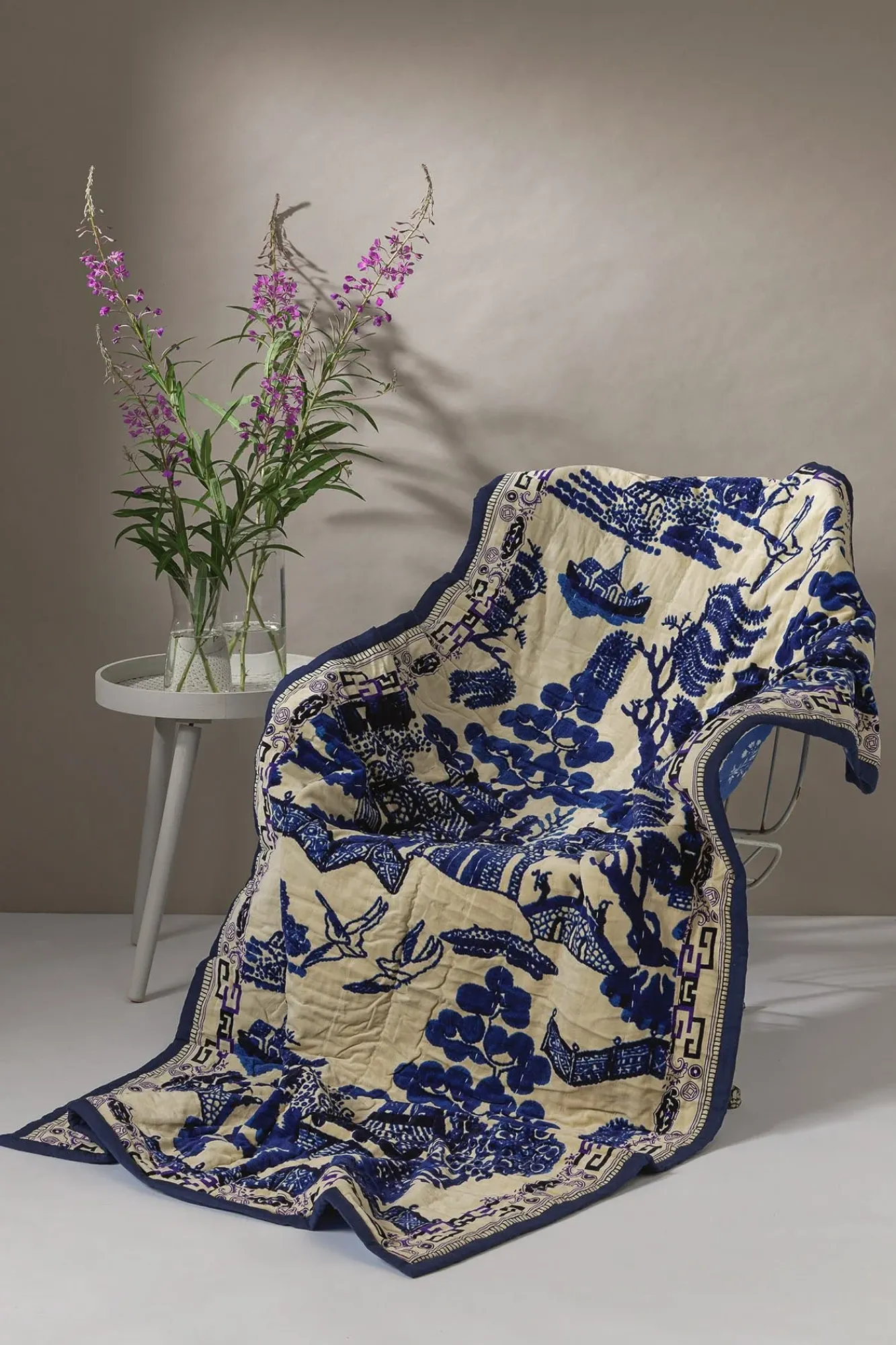 One Hundred Stars Giant Willow Velvet Throw In Blue Features The Classic Blue And White Willow Print Which Can Often Be Found Adorning Vintage Pottery. This Giant Willow Throw Is Finished With White Handstitched Quilting. The Reverse Is A Flower Block Print Design In White On A Cornflower Blue Background.