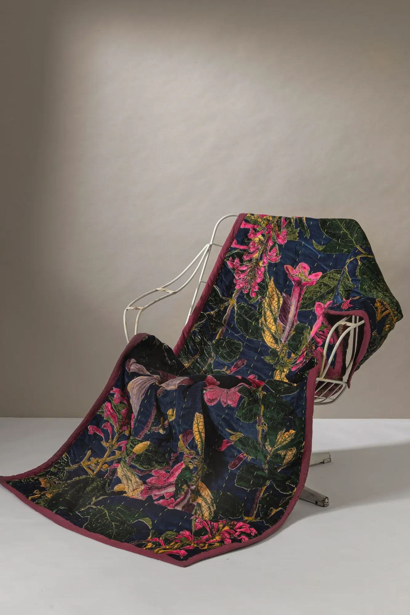 Part Of The One Hundred Stars Collaboration With Kew Royal Botanic Gardens Range, The Magnolia Blue Velvet Throw Has Been Created From One Of The World’S Foremost Archives Of Rare And Historically Significant Artwork, This Throw Is Finished With Green Handstitched Quilting. The Reverse Is A Leaf Block Print Design In Rich Burgundy And Green.
